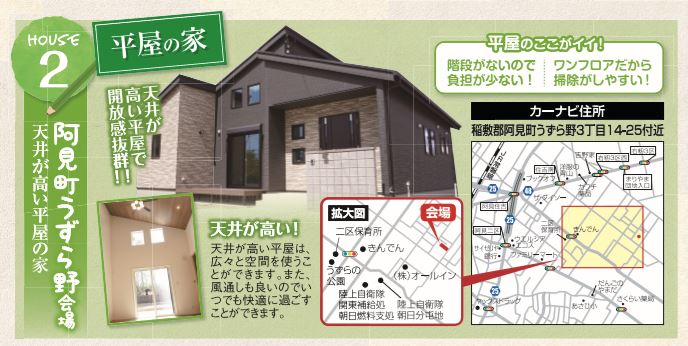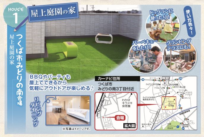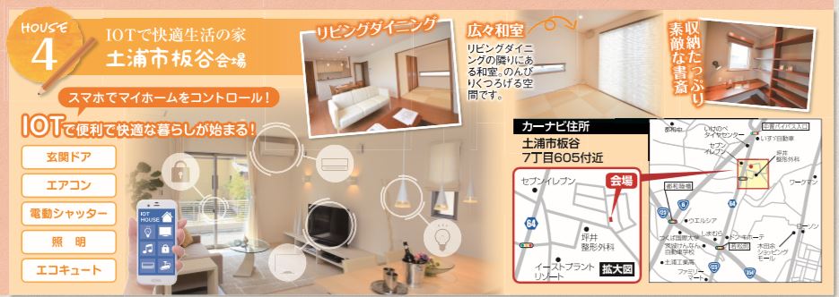 2019年5月3日(金)4日(土)5日(日)6日(月)、つくば市みどりの南会場[屋上庭園の家]、阿見町うずら野会場[天井が高い平屋の家]、牛久市ひたち野西会場[IOT住宅]、土浦市板谷[IOT住宅]の4会場にて完成見学会を開催いたします。