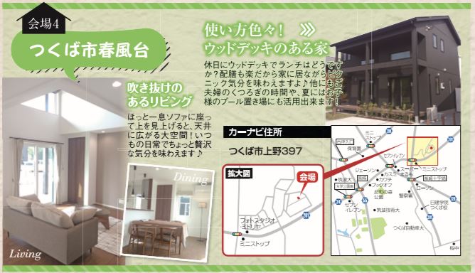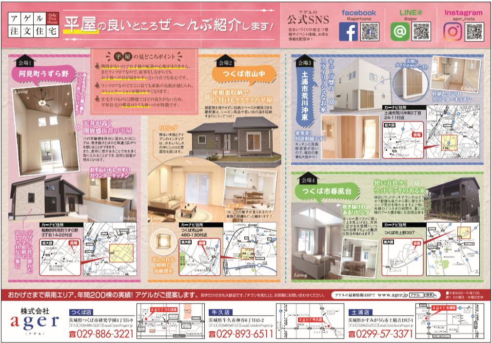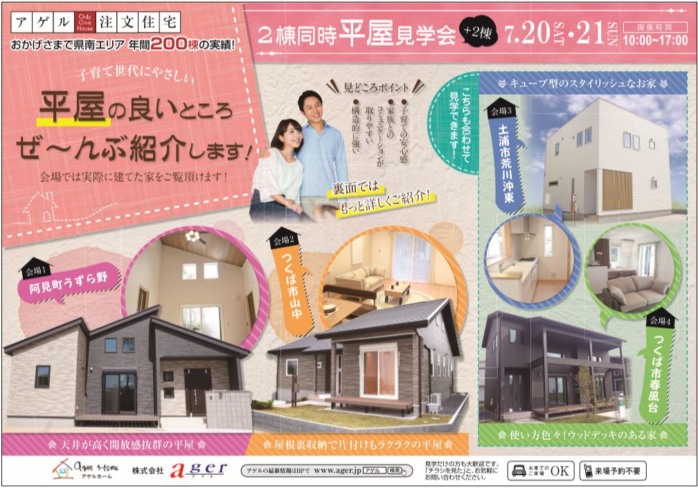 2019年7月20日(土)21日(日)、阿見町うずら野会場[平屋の家]、つくば市山中[平屋の家]、土浦市荒川沖東会場[キューブ型のスタイリッシュな家]、つくば市春風台[使い方色々!ウッドデッキのある家]の4会場にて完成見学会を開催いたします。