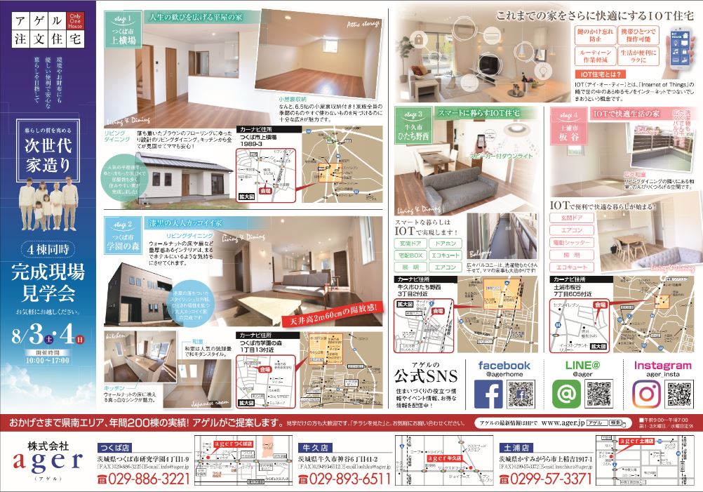 2019年8月3日(土)4日(日)、つくば市上横場[平屋の家]、つくば市学園の森[漆黒の大人かっこいい家]、牛久市ひたち野西[IoT住宅]、土浦市板谷[IoT住宅]の4会場にて完成見学会を開催いたします。