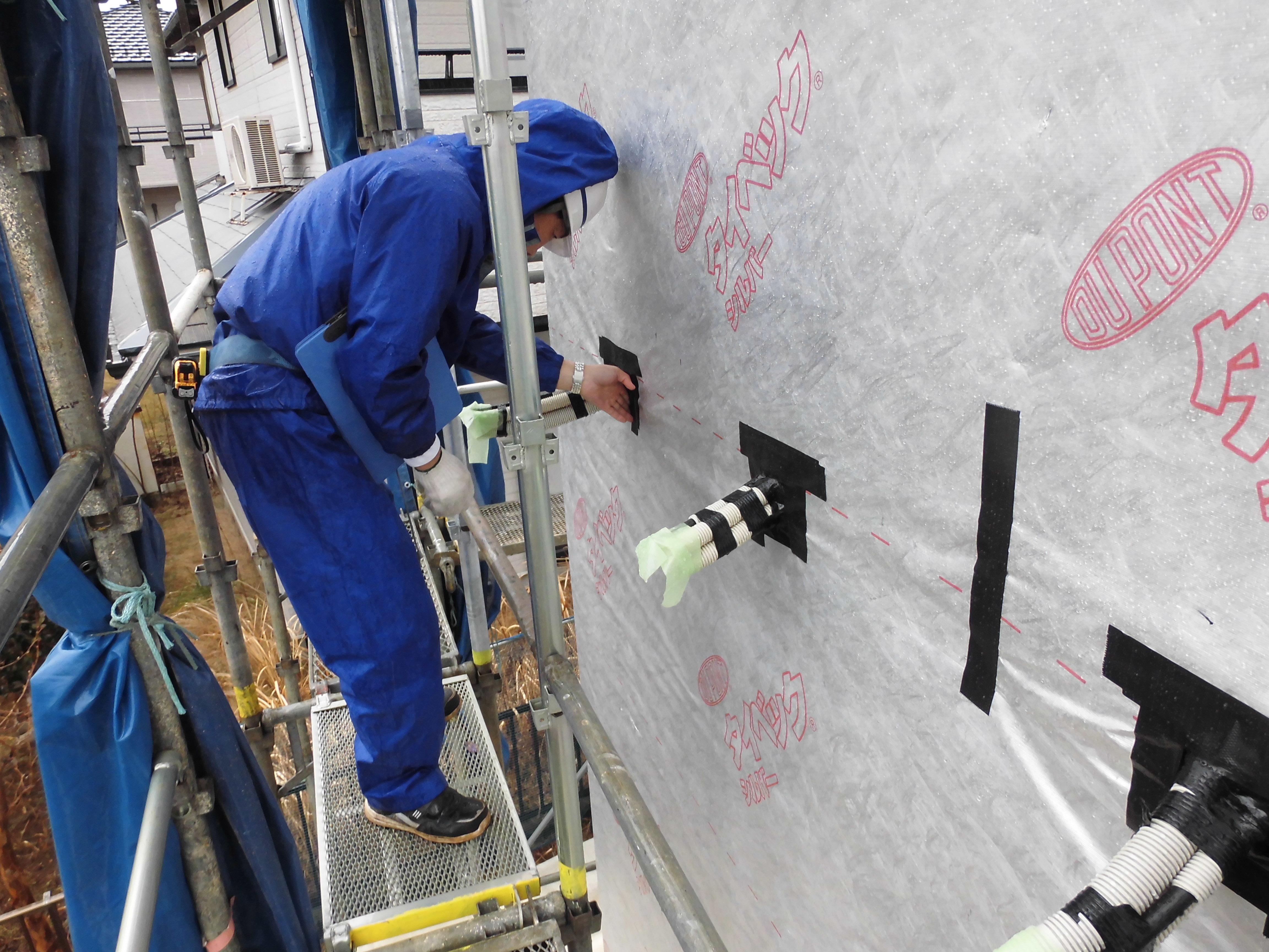 雨水の侵入を防ぐ防水紙がきちんと張られているかのチェックをします。