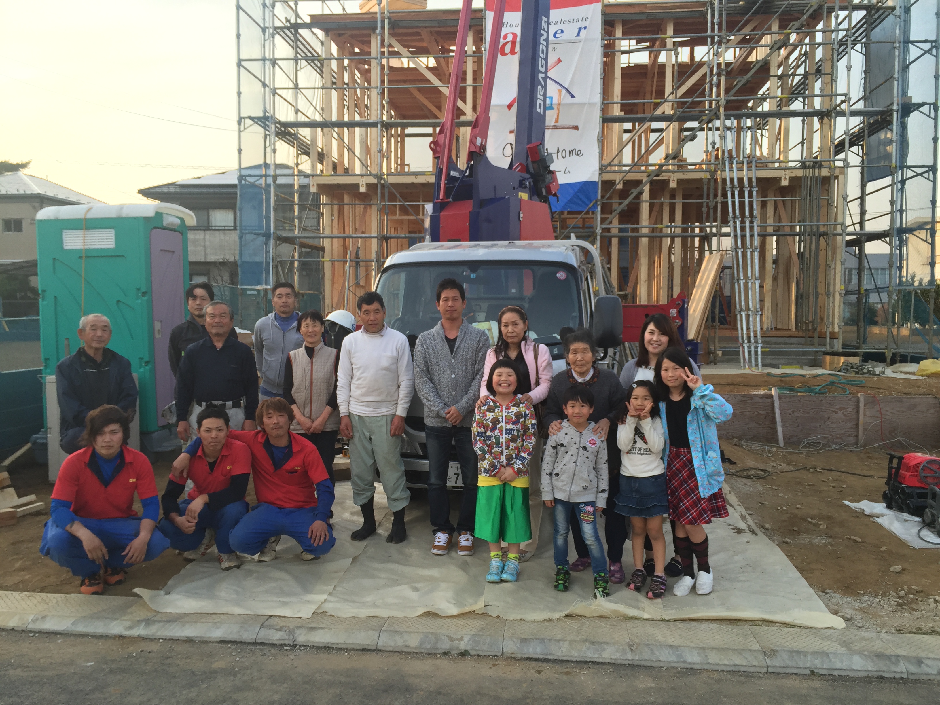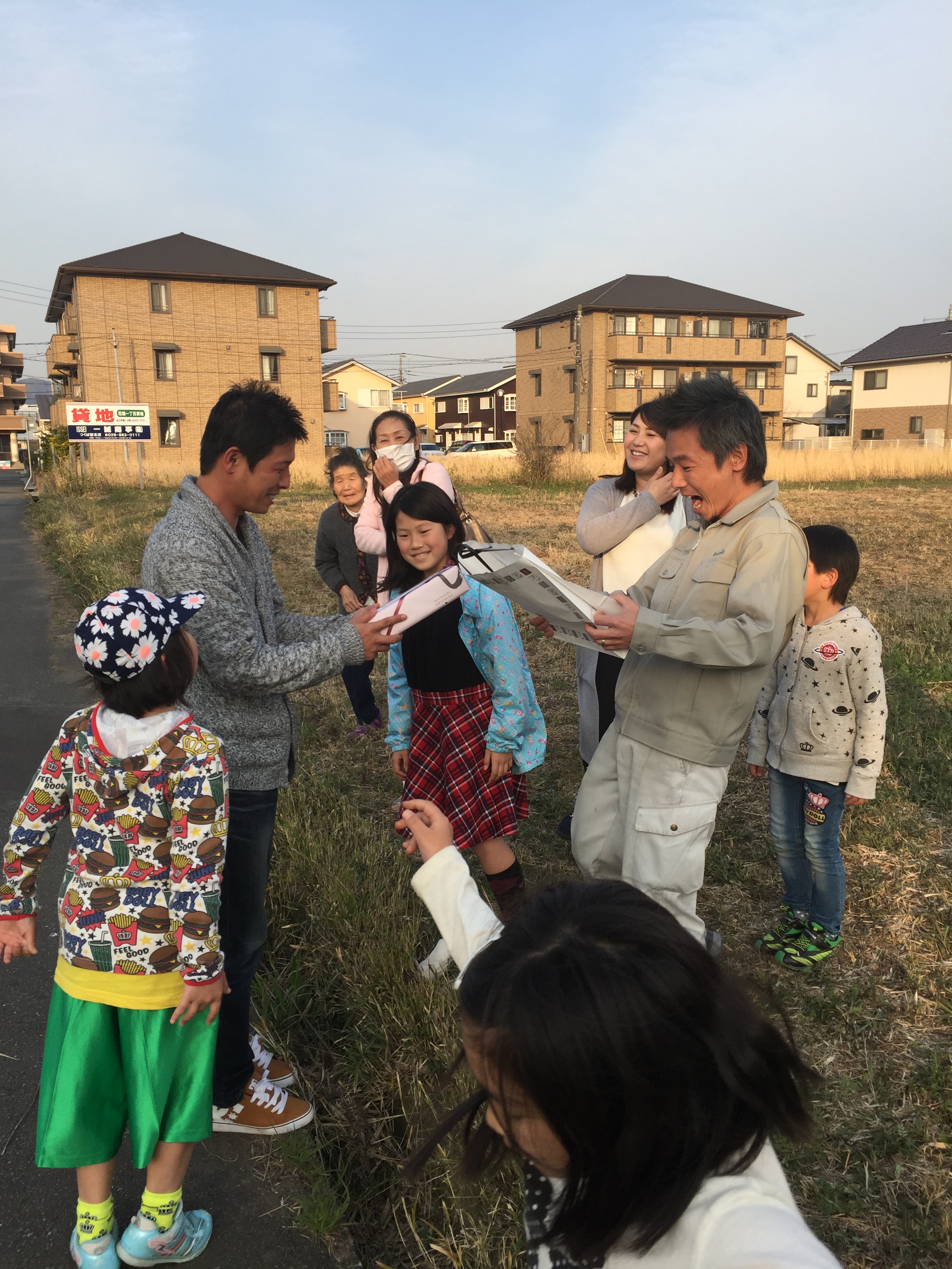 無事お清めも完了しての記念撮影(^o^)V お友達の方も駆けつけていただきユーモアあふれる贈り物にみんなで大爆笑!終始笑顔のあふれる上棟式になりましたヽ(=´▽`=)ノ