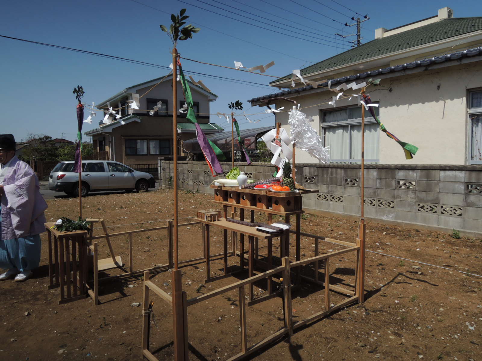 4月中旬に地鎮祭が執り行なわれました。この日は、お天気にも恵まれとても暖かい日でした。