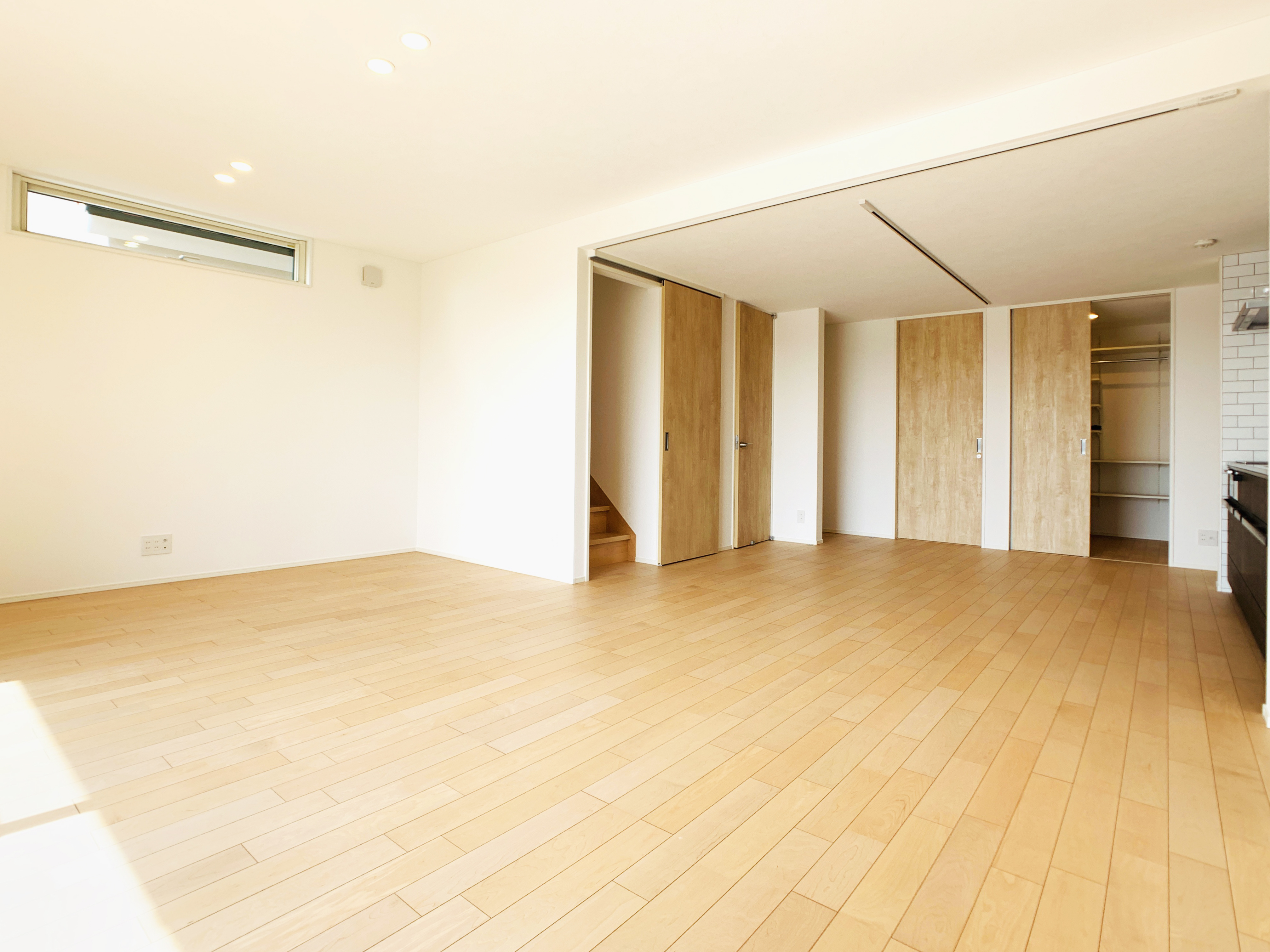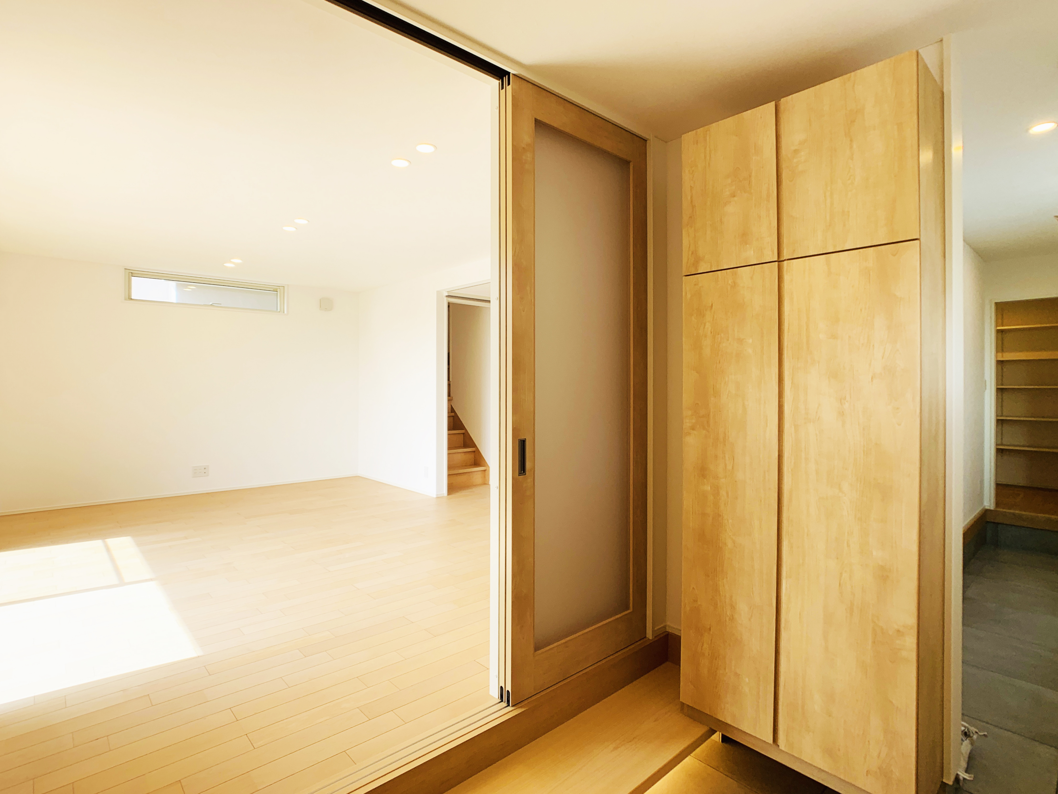 玄関を入ると目に飛び込んでくるのは天井までのハイドアと長いホールが開放的に広がります。