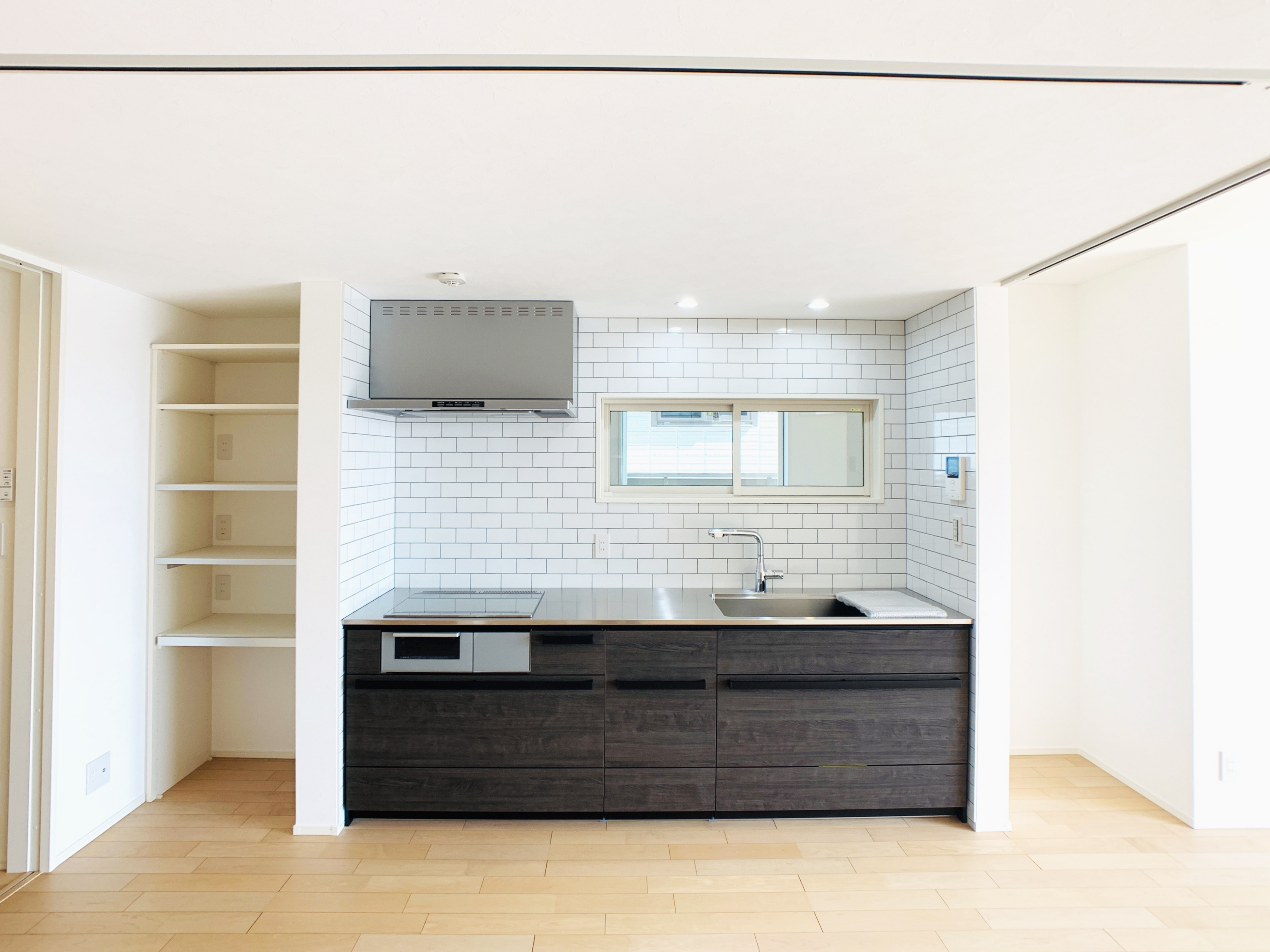 壁付けキッチンも室内窓を付けると明るく、楽しくお料理ができます