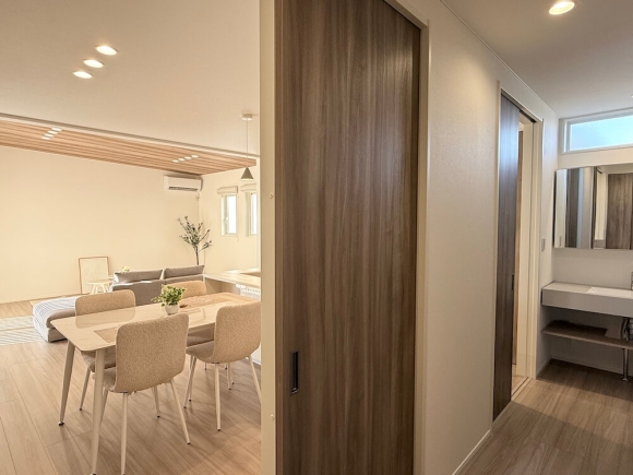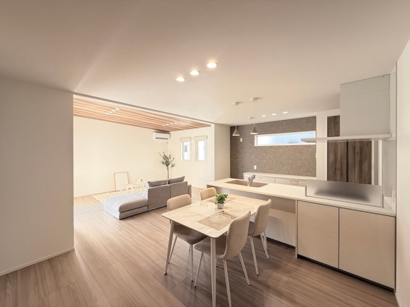 オープンキッチンでお料理をしながら ダイニングで過ごすご家族を見守れます。 家事動線にも配慮しながら居室とLDKを分けることにより 来客時にもプライベートが保たれます。