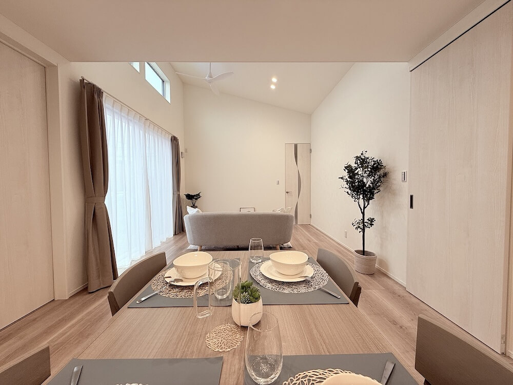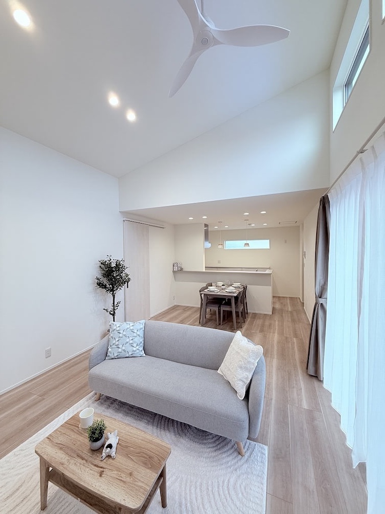 白を基調にした内観で屋内の明るさを演出。リビングは勾配天井の開放感も相まってストレスを感じない空間です。導線をしっかりと確保した間取りので日々の快適な生活送れます。
