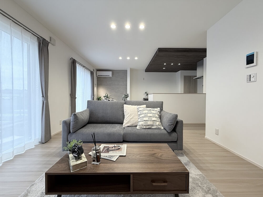 大きな窓から光が差し込む明るいLDK。木目×グレーで落ち着いた上質な空間に