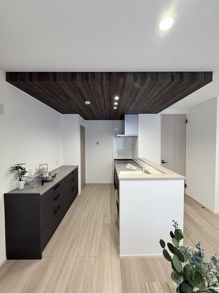 今人気の下がり天井を採用したキッチン。立体的なデザインで魅力あふれる空間に。