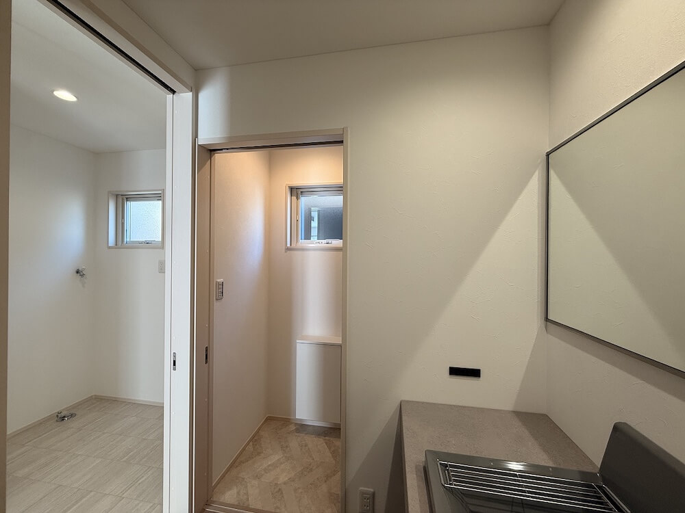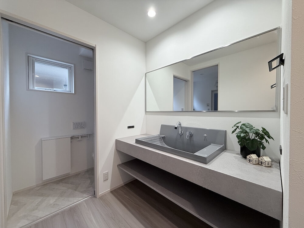 広がりを感じるワイドミラーと造作風カウンター。毎日の身支度を素敵な場所で。